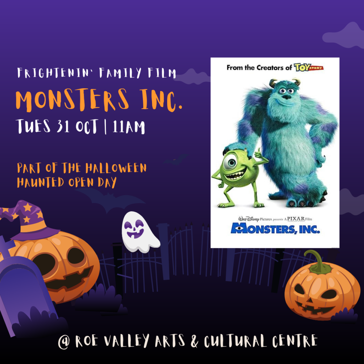 Join us as we kick off our Haunted Halloween Open day with a Screening of Monsters, Inc.