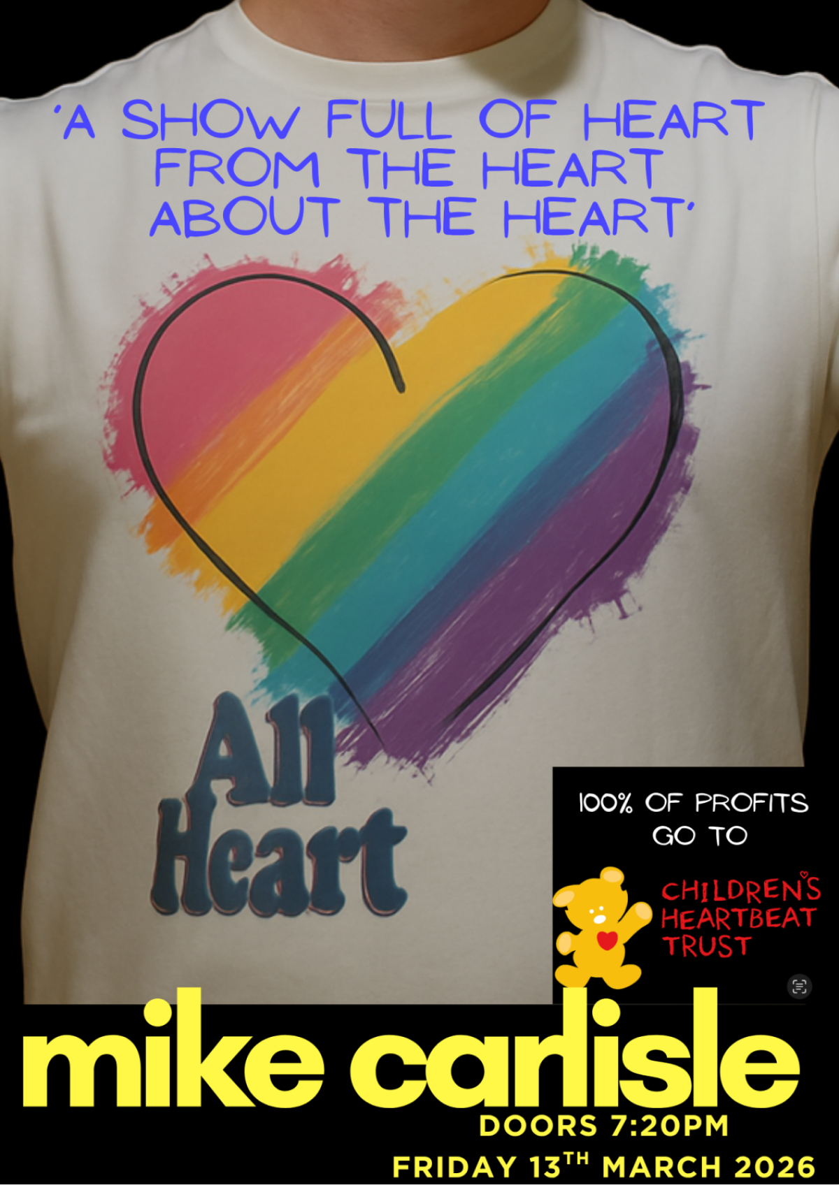 A hilarious telling of a father’s journey through discovering his son’s heart condition and the mental spiral that ensued. You don’t think that sounds funny? It doesn’t! But Mike brings hilarity to each moment through this energetic and laugh a minute performance. All profit goes to the Children’s Heartbeat Trust.