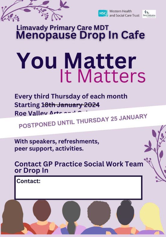 The Limavady Primary Care Menopause Drop In Cafe is NOW POSTPONED to Thursday 25 January due to the adverse weather conditions.